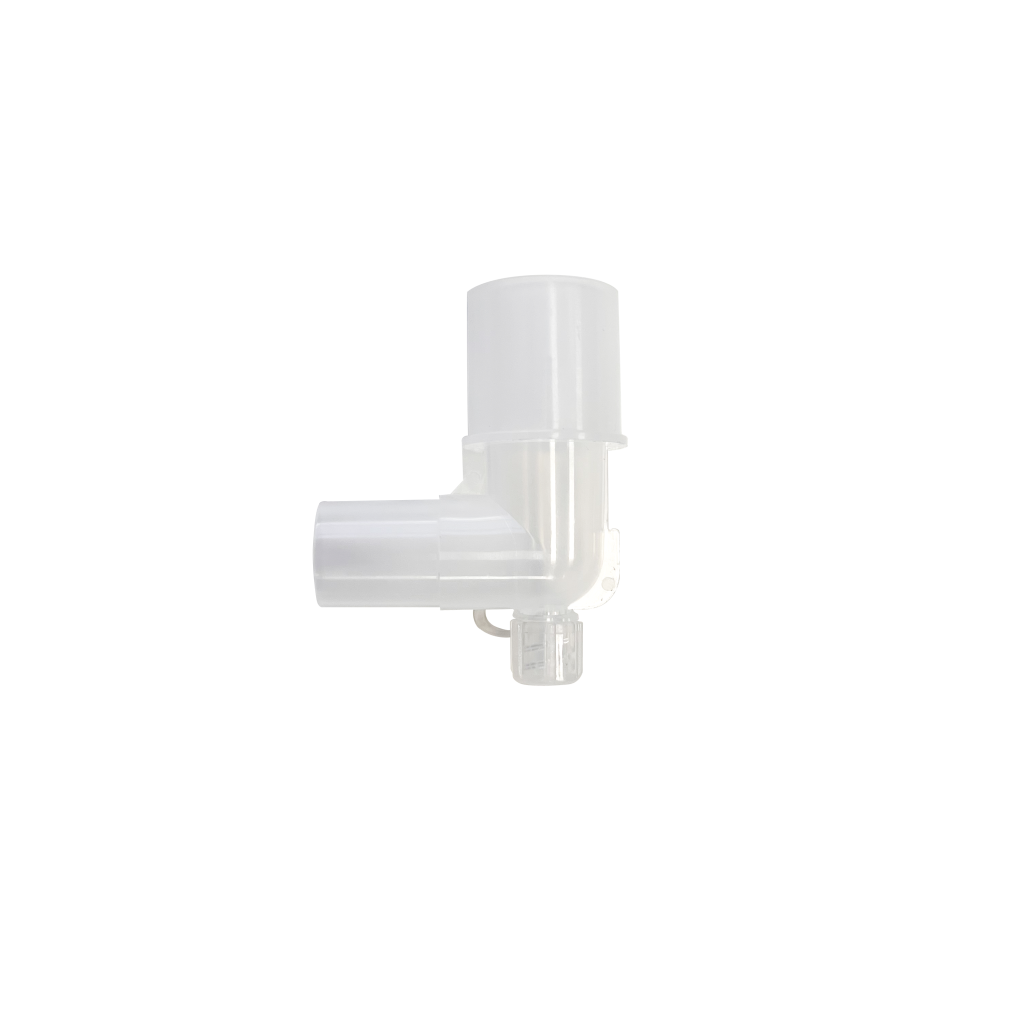 A component that allows a change in direction of tubing or connection in medical equipment, facilitating ergonomic positioning or adaptation in various respiratory setups.