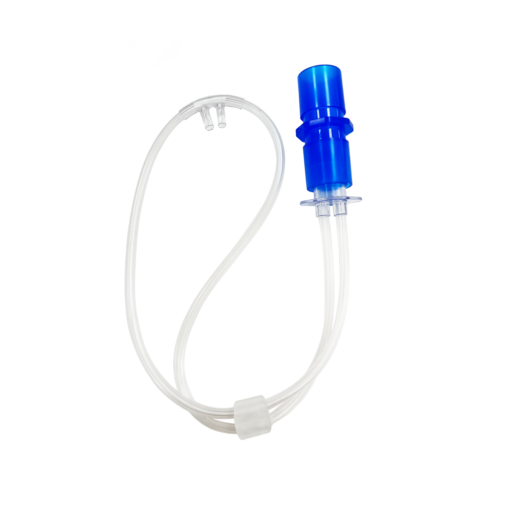 A specialized nasal cannula designed with soft prongs that deliver high-flow oxygen therapy, typically used for patients requiring increased oxygen levels.